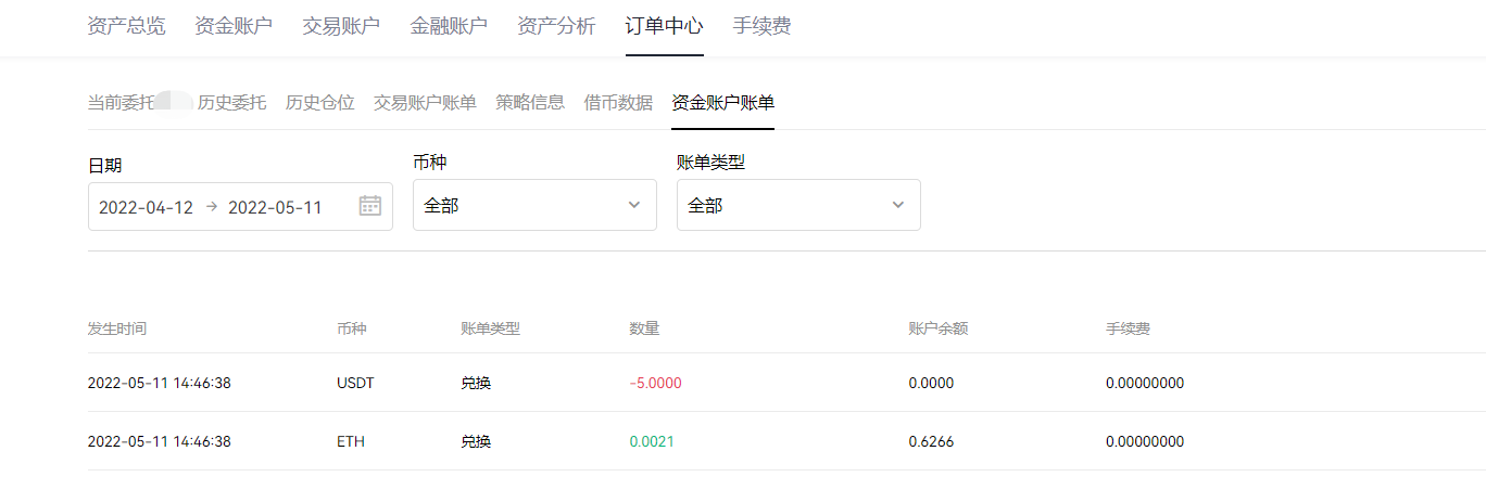 第三步:兑换获得的数字资产将自动划转至您的资金账户,您可点击查看账单,也可在资产管理下拉列表中进入“订单中心”进行查看。